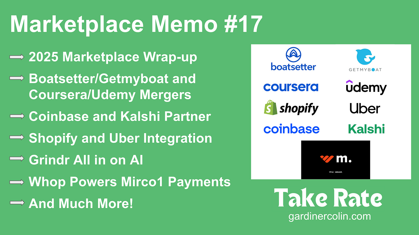 2025 Marketplace Wrap-up, Boatsetter/Getmyboat and Coursera/Udemy Mergers, Coinbase and Kalshi Partner, Shopify and Uber Integration, Grindr All in on AI, Whop Powers mirco1 Payments and Much More!