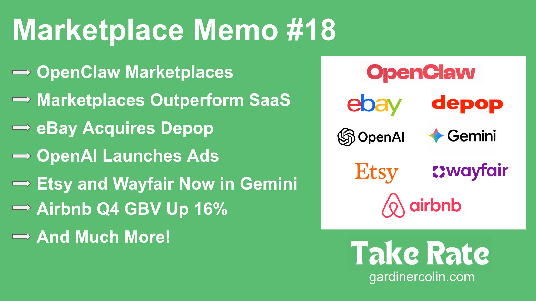 OpenClaw Marketplaces, Marketplaces Outperform SaaS, eBay Acquires Depop, OpenAI Launches Ads, Etsy and Wayfair Now in Google Gemini, Airbnb Q4 GBV Up 16% And Much More!