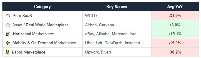 My other friends at SNAK Venture Partners dug even deeper into the data. Over the last 12 months, WCLD (the cloud SaaS ETF) is down -31.2%, with Adobe and Salesforce both off -42.5%. Meanwhile, horizontal marketplaces like eBay, Alibaba, and MercadoLibre averaged +15.1%, and asset marketplaces like Carvana were up +25.9%. An equal-weighted basket of marketplace stocks (excluding labor) outperformed WCLD by more than 30 percentage points.
