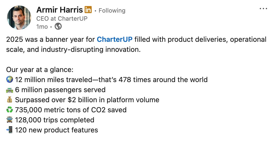 “CharterUP 2025 Recap: Year in Review” - CharterUP surpassed $2B in platform volume, completed 128,000 trips, and served 6M passengers across 12M miles traveled. LinkedIn