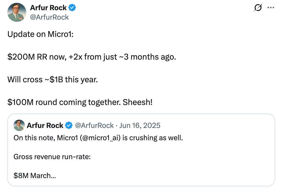 “Update on Micro1: $200M RR now” - Micro1, the AI talent/data labeling marketplace, hit $200M in recurring revenue, a 2x jump in roughly 3 months, with a $100M round coming together. X