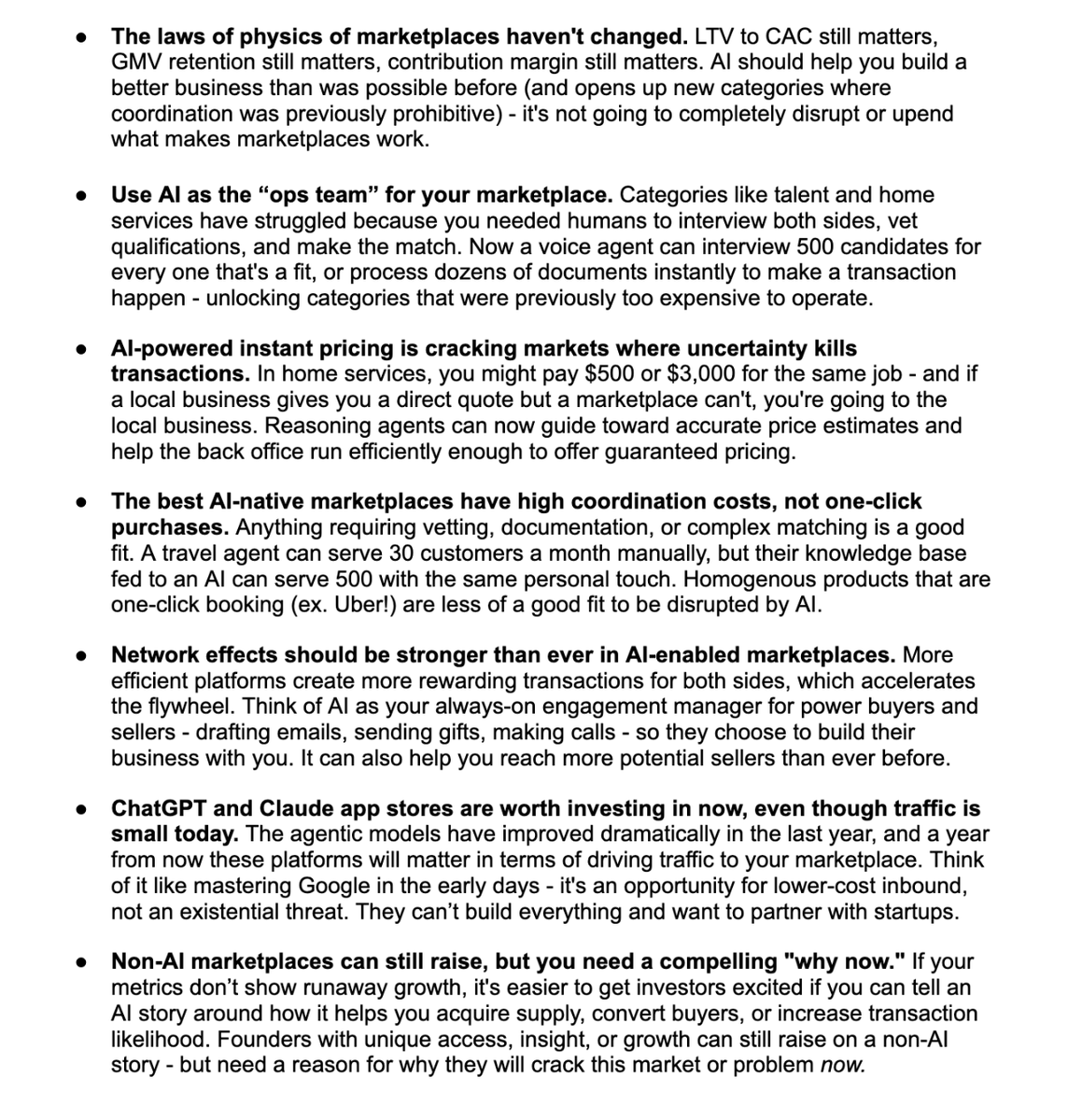 “Top tips for founders building marketplaces in the AI era” - Olivia Moore at a16z shared her framework for how marketplaces are evolving in 2026, drawing on lessons from Airbnb, Instacart, and Whatnot. Required reading for marketplace founders! X